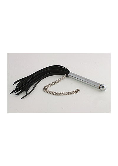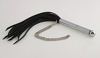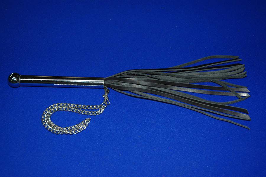 Плетка кожаная, 16-ти полосная (хромированная ручка и петля на руку). Используется для разогрева тела перед флагелляцией или может служить серьезным инструментом для коротких и сильных воздействий. Имеет большую площадь соприкосновения с телом, вследствие чего сила удара равномерно распределяется по всей площади контакта. Благодаря этому удар получается мягким и безопасным. Очень хороша и удобна при работе с двух рук (совместно с другим флогером, плетью и др. девайсами)