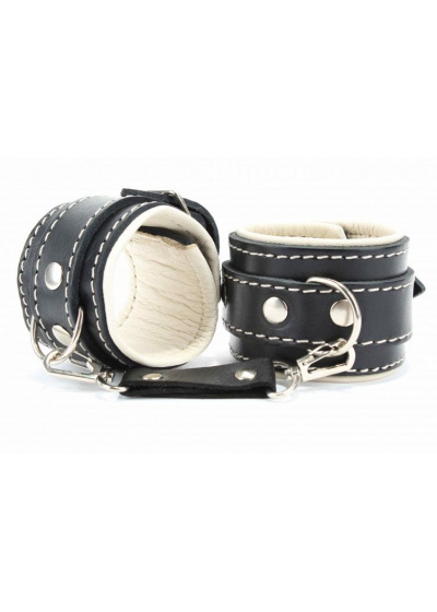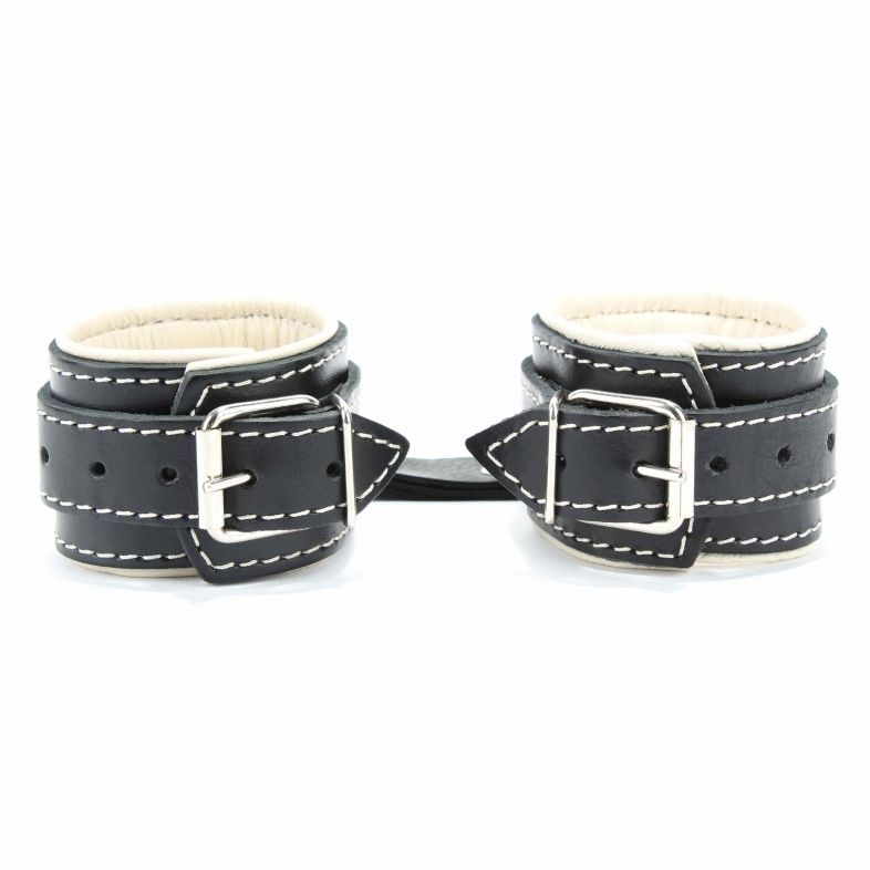 Наручники выполнены из толстой ременной кожи с подкладном из светло бежевой перчаточной кожи. Аксессуар декорирован светлой строчкой. Металлическая пряжка крепко удерживает в подчинении, кожаное соединение на карабинах фиксирует наручники вместе. Ремни позволяю выбрать нужный размер, подойдут на обхват от 18 до 25 см. Мягкий подклад обеспечивает комфорт, помогая полностью погрузиться в БДСМ игру. Ширина - 6 см. Длина соединения - 15 см.