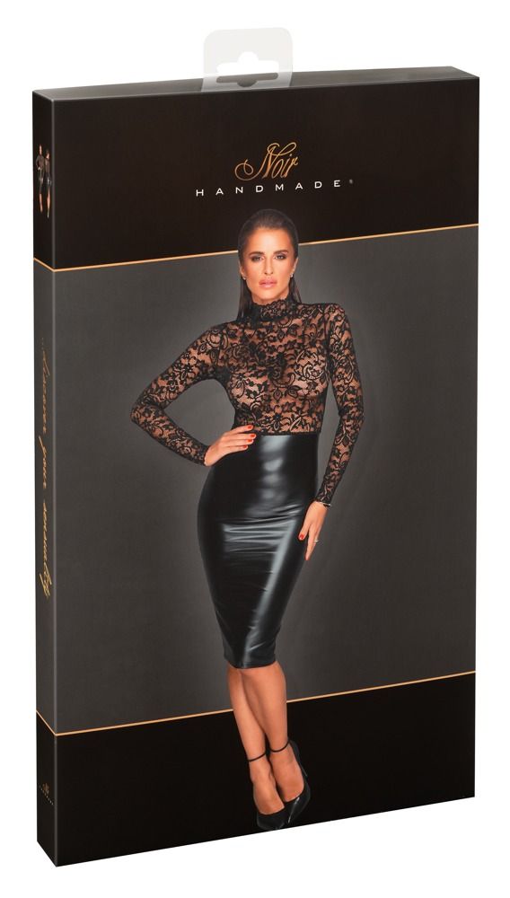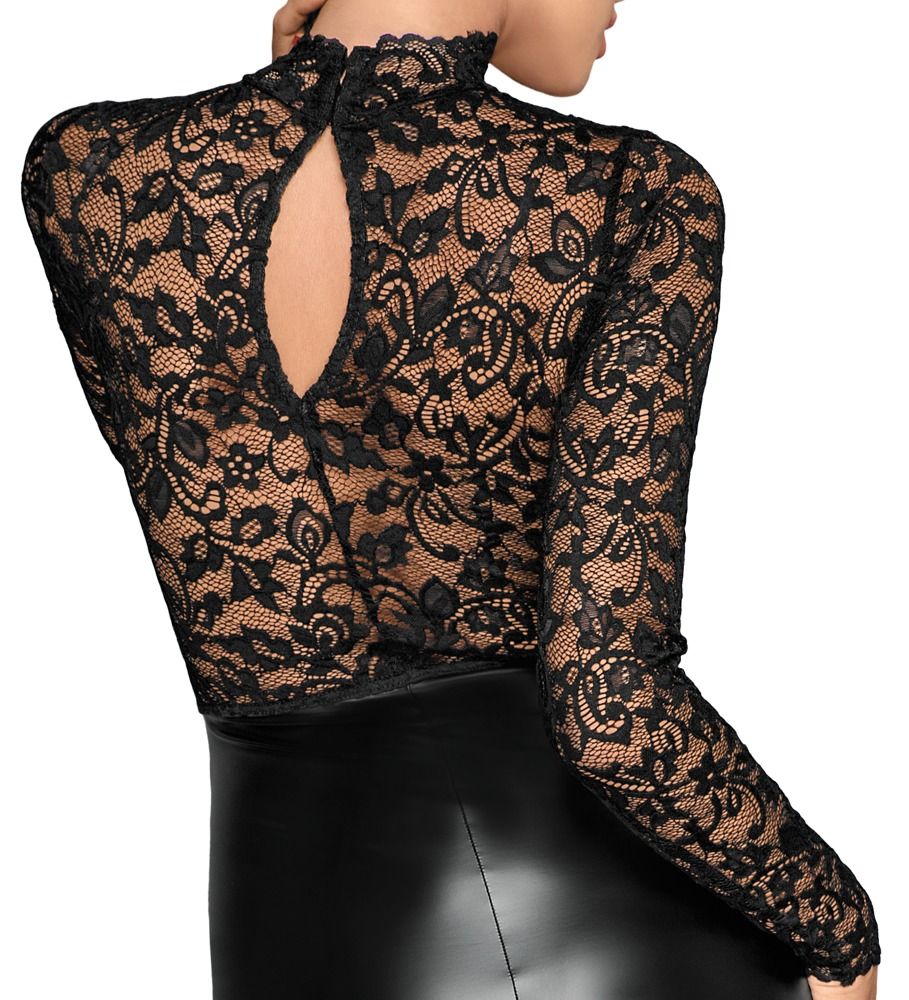 Платье до колен с длинными рукавами, в обтяжку, строгий крой в черном элегантном сочетании мягкого кружева (верх) и матового блестящего материала wet-look (часть юбки). Небольшой воротник-стойка, застегивающийся на 2 пуговицы сзади. Небольшой разрез на подоле сзади.