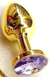 Если секс, то восхитительный! Если секс-игрушка, то прекрасная во всех отношениях! Эта золотая анальная пробка – всё что нужно для красивого секса. Она, украшенная нежно-сиреневым кристаллом и покрытая позолотой, с легкостью проникает в анус. Процесс введения, равно как и вынимания, неизменно доставляет удовольствие. Изготовлена из медицинской стали с позолотой. Длина 7.5 см, диаметр 2.7 см. Вес 150 гр.