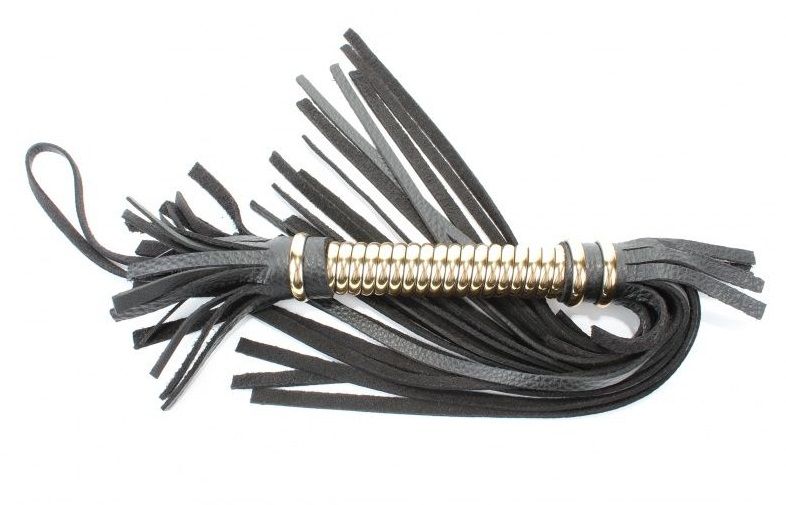 Плеть выполнена из натуральной кожи черного цвета. Стильная витая металлическая рукоятка золотого цвета и мягкие хвосты аксессуара доставят незабываемое впечатление, позволят партнерам воплотить самые сокровенные желания. Для удобства на верхней части рукоятки расположена петелька. Количество хвостов - 20 штук. Длина рукояти - 16 см.