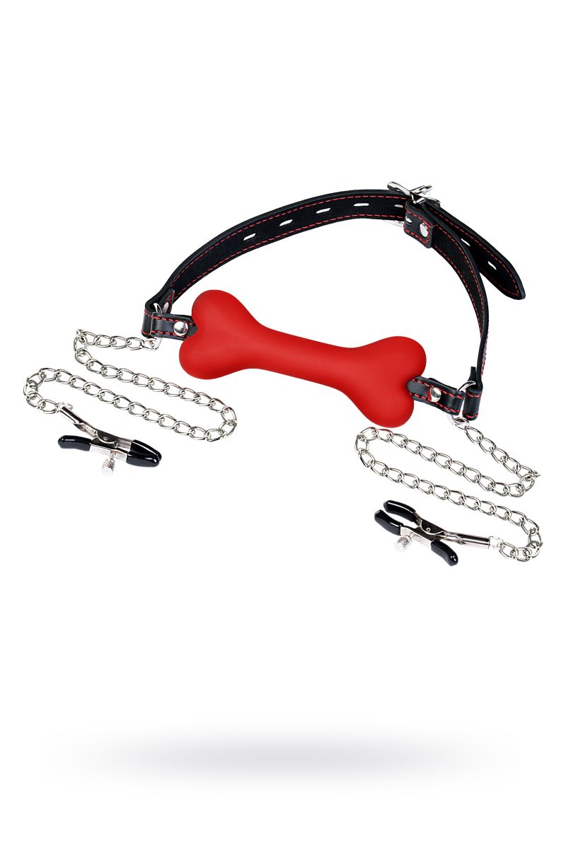 Красный кляп-трензель Theatre в виде косточки с зажимами для сосков (арт. 708027)