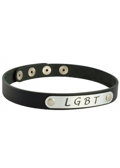 Чокер изготовлен из натуральной кожи и дополнен вставкой под металл с надписью LGBT. Регулируется при помощи кнопок.
