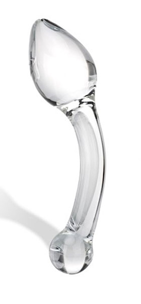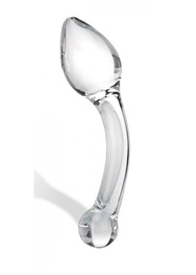 Двойной стимулятор с изогнутым стволом для массажа простаты из кристально-прозрачного стекла ручной работы. Длина - 20 см. Диаметр маленькой головки - 3,5 см. Диаметр крупной капли - 5 см.