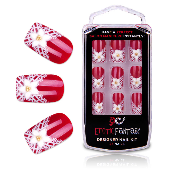 Красные типсы для ногтей с белыми цветами White Lily (арт. EF-NS10)