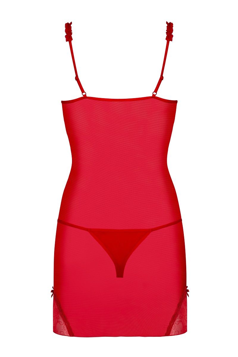 Тоненькая облегающая сорочка яркого цвета, плюс трусики-стринги. Лиф украшен брошью. В комплекте: сорочка, трусики-стринги.