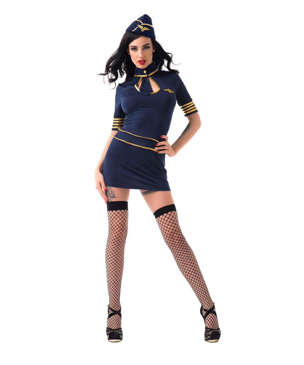 Просматриваете каталоги магазинов костюмов для новогодней вечеринки? Остановите свой взгляд на синем платье от наряда стюардессы. Золотистая отделка, имитирующая форменные шевроны, воротник-стоечка и галстук создают образ полный и законченный. В комплекте: платье, головной убор.
