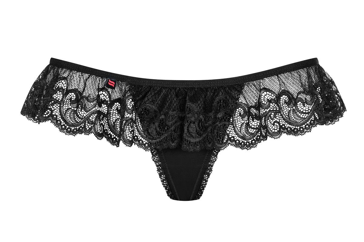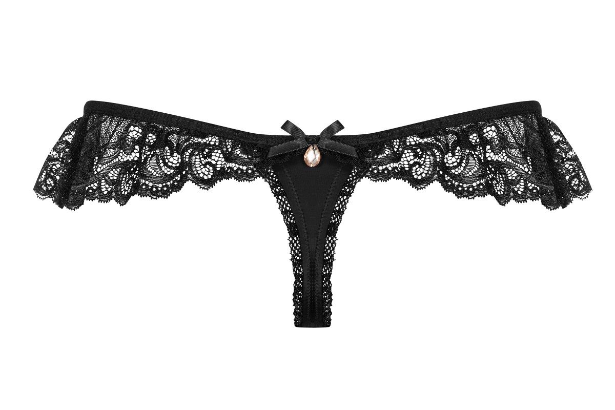 Чудо как хороши! Сексуальные трусики-стринги, украшенные широкой кружевной лентой спереди. Эффект легкой полупрозрачной юбочки с витиеватым узором. Сзади – сияющая подвеска на миниатюрном бантике. При вечернем свете она притягивает еще больше внимания своим блеском. Наряд, для которого уже не нужны никакие дополнительные аксессуары. Такие трусики вполне могут стать тем единственным предметом туалета, который нужен для романтического вечера. Очень женственный, чувственный и притягательный образ.